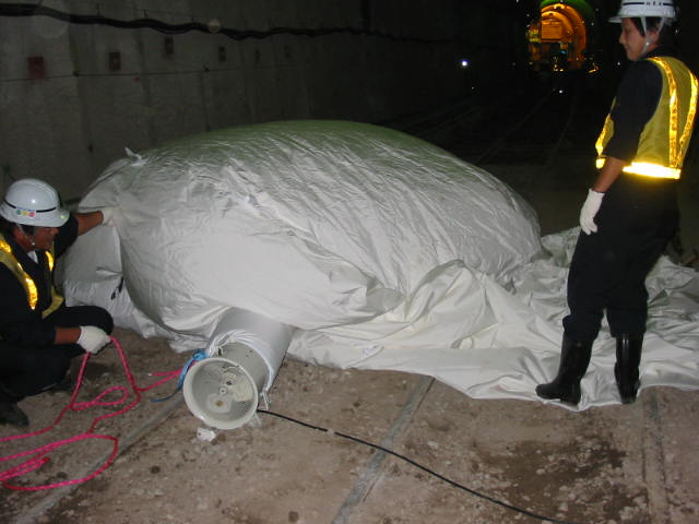 トンネル工事における粉塵飛散を効果的に防ぐ、発破用バルーンです。